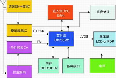 本方案选用1.2GHzVIAEden处理器,并配备VIACX700M2系列媒体处理芯片组。该系列属于X86体系,可运行WINDOWSCE和LINUX嵌入式操作系统。该类IC具有硬件的MPEG2解码功能,便于开发基于PC的数字高清电视。从系统框图中可以看出,该方案是在PC主板的基础上增加了数字高清电视高频头和信道解码部,以及模拟信号高频头和标清信号的解码部分。为节约研发成本,PC部分可以直接选用威盛的EPIANX系列嵌入式主板。