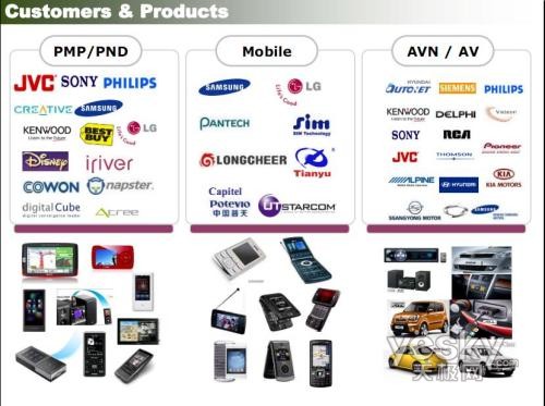 从上面表中可以看到,与telechip合作的国际国内品牌也是相当多的。应用领域包括PMP/PND/MOBILE/AVN/AV等领域。