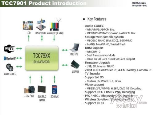 在功能方面:Telechip7901支持视频输出功能(tv-out),支持画中画功能,在音频方面,支持WMA,MP3,OGG,AAC+等格式,视频方面,支持MPEG1/2/4,WMV9,H.264,DIVX4/5,视频功能的支持方面提升不少。Telechip7901采用双芯架构,可以分别处理GPS与CMMB等多线程任务。