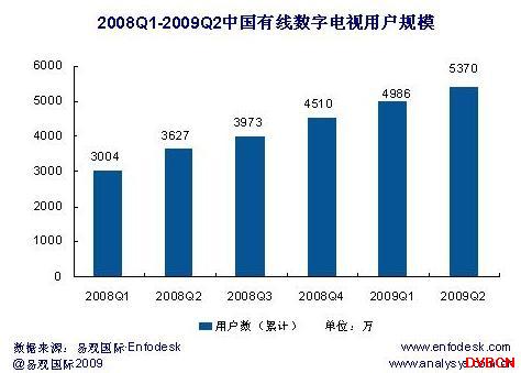 【DVBCN网讯】据易观国际Enfodesk产业数据库最新发布《2009年第2季度中国DTV市场季度监测》数据显示,截止2009年第2季度中国有线数字电视用户规模达到5370万户,2季度新增用户约384万户。