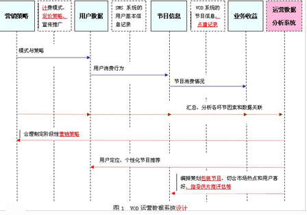 有线网络运营商可以充分利用现有的SMS系统和VOD统计分析系统,获取点播用户的特征信息、节目管理信息和点播统计记录等运营数据,结合所采取的营销策略,建立VOD运营数据分析与挖掘系统,并以该系统为核心通过量化方式对VOD业务的整体运营情况进行系统分析,由此探索精细化的业务运营模式,最终达到业务增收的目的(如图1所示)。