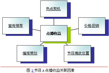 横向关联分析的目的在于了解函数①中各个变量之间的相关联系,即针对多个特定数据的发展趋势及关联效果进行分析。如分析在一定时间周期内,由于节目内容和业务宣传费用投入的调整,以及VOD用户数量的变化,最终对业务收益的走势产生了怎样的影响。仍以深圳互动电视近期热点电影A为例,该节目的点播收益之所以相较其他同类节目更为突出,是多种因素共同作用的结果(如图2所示),包括用户数量的增加、营销策略的调整( 宣传推荐力度、摆放位置)、内容本身的特殊性(特别新引进的热播节目)。据此我们可以了解促进单个节目收益攀升的规律,并结合纵向趋势分析,进一步推断各个变量对最终效果影响的权重比例。