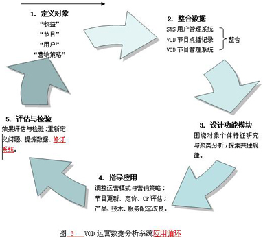 VOD业务运营数据的分析和应用是一个联动的过程:一方面,运营商收集相关数据并作汇总分析,根据分析结论指导业务运营策略的修正和调整;另一方面,运营商又可以通过对前期数据指导下产生的新的运营数据进行评估,反过来改进数据分析和挖掘过程中由于各种因素造成的不足之处(如图3所示)。正是不断地经过上述循环校正,才能使业务运营数据系统的分析才为合理,更加贴近日益变化的市场情况,才能够为业务运营提供科学、有效的指导。