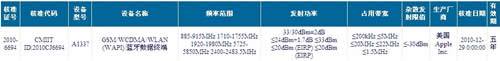 工信部无线电管理局网站显示,该局于2010年12月29日核准通过了一款苹果WCDMA/WLAN数据终端,设备型号为A1337,核准证号为CMIIT ID:2010CJ6694,有效期5年。