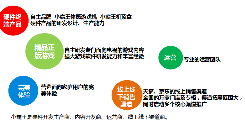 据方总介绍,小霸王自身产业链包括硬件终端产品、精品正版游戏、运营团队、完美体验、线上线下销售渠道。
