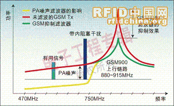 GSMTX影响移动电视接收机的第二种途径是通过功放(PA)噪声。如果在DVB-H频率范围内由功放引起的典型噪声功率在100kHz带宽下测得为-85dBm左右,那么当天线隔离度为10dB时,在射频参考点测得的落入8MHz信道中的噪声约为-76dBm。这一噪声无法被移动电视接收机滤除,必须在GSM900TX后插入一个高通滤波器才能将此噪声滤除,见图1和图2。在这种情况下需要约30dB的衰耗。这无疑会吃掉本已紧张的PA功率预算,从而导致PAE的降低。
