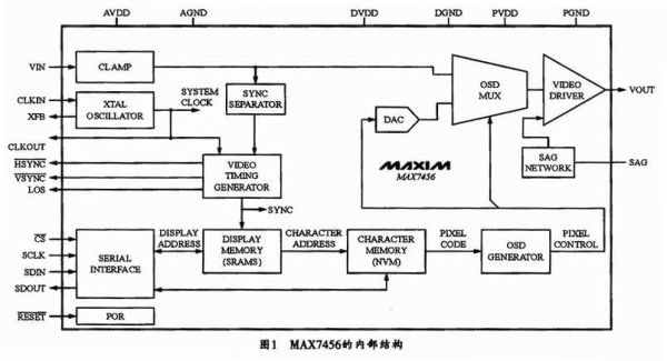 MAX7456内部集成有产生用户定义的OSD以及将其插入复合视频信号所需的全部功能和EEPROM。该器件内置输入箝位、同步发生器、视频定时发生器、OSD插入MUX、非易失(EEPROM)字符存储器、显示存储器、OSD发生器、晶体振荡器、可读/写OSD数据的SPI兼容接口以及视频驱动器。MAX7456芯片的内部结构如图1所示。